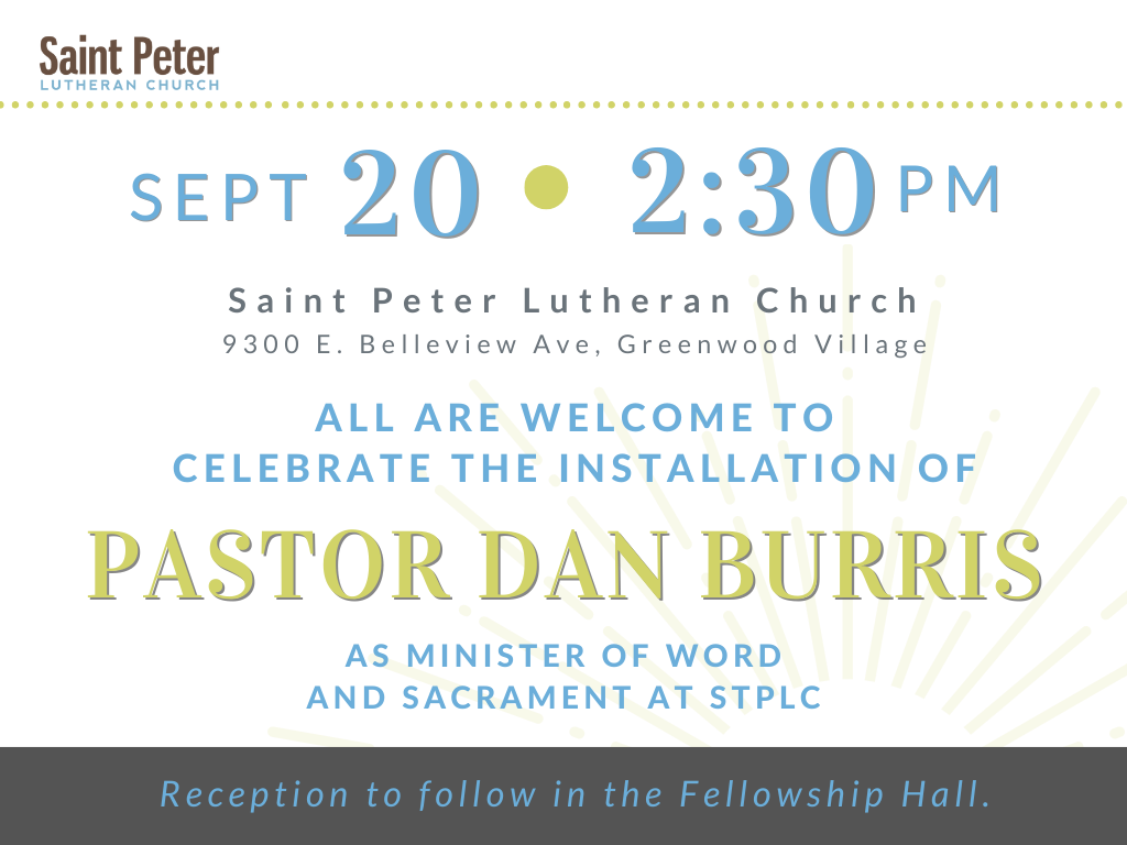 Pastor Dan’s first Sunday was September 7. Check out the newsletter to read his introduction letter! All are invited to celebrate Pastor Dan’s installation at Saint Peter on September 20 at 2:30 p.m. Pastor Dan — we are thrilled and grateful to welcome you and your family to Colorado and to Saint Peter. We are so excited to explore where God is leading the mission and ministry of this church!